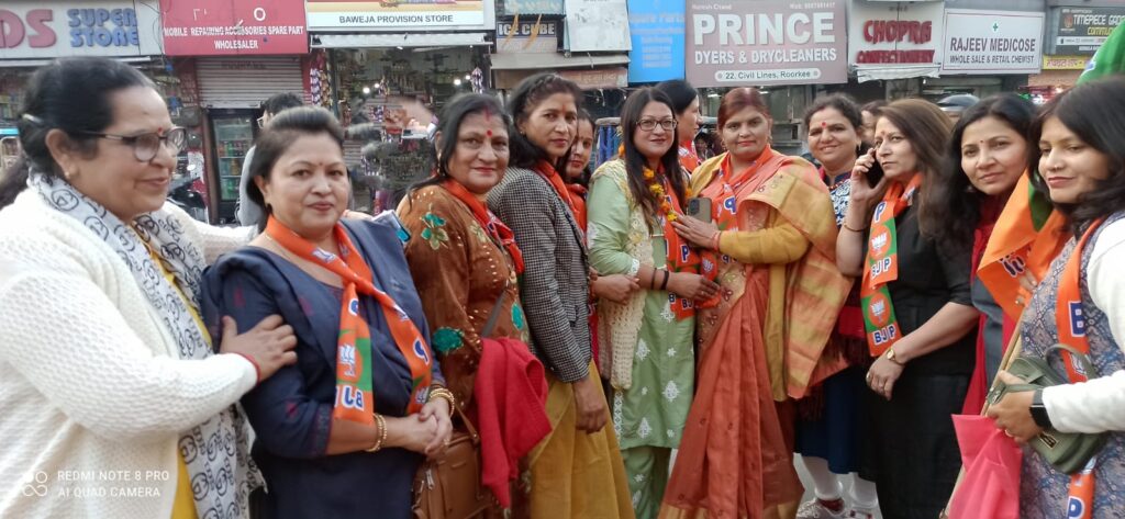 भारतीय जनता पार्टी रुड़की पूर्वी की महिला मोर्चा की मंडल अध्यक्ष नीलकमल शर्मा द्वारा राजस्थान विधानसभा के प्रचार में भाग लेने तथा वहाँ पर भारतीय जनता पार्टी को विजय दिलाने के लिए भारतीय जनता पार्टी महिला मोर्चा जिला रुड़की की जिला अध्यक्ष प्रतिभा चौहान का स्वागत करते हुए उनको धन्यवाद दिया गया इस अवसर पर महिला मोर्चा की जिला महामंत्री ममता राणा व हेमा बिष्ट जिला उपाध्यक्ष पुष्पा बडकोटी प्रदेश सदस्य सुनीता गोस्वामी महिला मोर्चा मंडल उपाध्यक्ष वर्णिका चौधरी महामंत्री सर्वेश गोस्वामी मंडल मंत्री सरीता जायसवाल भारतीय जनता पार्टी रुड़की पूर्वी की मंडल मंत्री पारुल भाटिया जिला मिडिया प्रभारी गीता मलिक मंजू रावत , मंडल अध्यक्ष पश्चिम तृप्ति कंसल मीनाक्षी पुष्पा एठानी, बसंती, लोकसभा शोसल मिडिया सदस्य नीरज रण्धावा आदि मौजूद रही । नीलकमल शर्मा मंडल अध्यक्ष महिला मोर्चा रूड़की पूर्वी