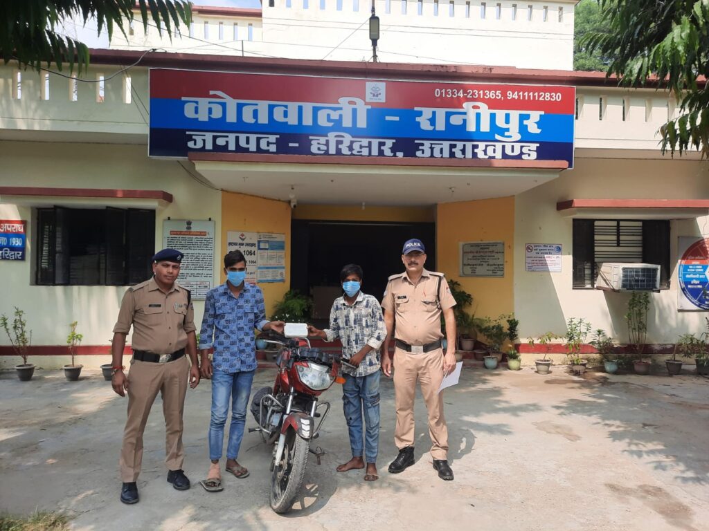 घटना के अनावरण हेतु तत्काल रानीपुर पुलिस द्वारा ठोस सुरागरसी पतारसी कर सीसीटीवी कैमरो का अवलोकन किया गया, तथा कल दिनांक 06.10.2024 को पुलिस टीम द्वारा मुखबिर की सूचना पर नहर पटरी रोड पर जमालपुर जाने वाले तिराहे से अभि0गण 1- सुहैल पुत्र अनवर निवासी ग्राम दादूपुर कोतवाली रानीपुर जनपद हरिद्वार उम्र-19 वर्ष व 2- जुबेर पुत्र रहीश निवासी मण्डी धनोरा थाना नई मण्डी जनपद सहारनपुर उ०प्र० हाल निवासी ग्राम दादूपुर कोतवाली रानीपुर जनपद हरिद्वार उम्र-21 वर्ष को मोटर साईकिल अपाची लाल रंग बिना नम्बर प्लेट सहित गिरफ्तार कर अभि0गण के कब्जे से एक अदद मोबाइल फोन-realme, 8-S,5-G की बरामदगी की गयी । अभि0गण के विरूद्ध धारा- 317(2),3(5) बीएनएस की वृद्धि की गयी । गिरफ्तार अभि0गण को आज मा0 न्यायालय में पेश किया जा रहा है ।